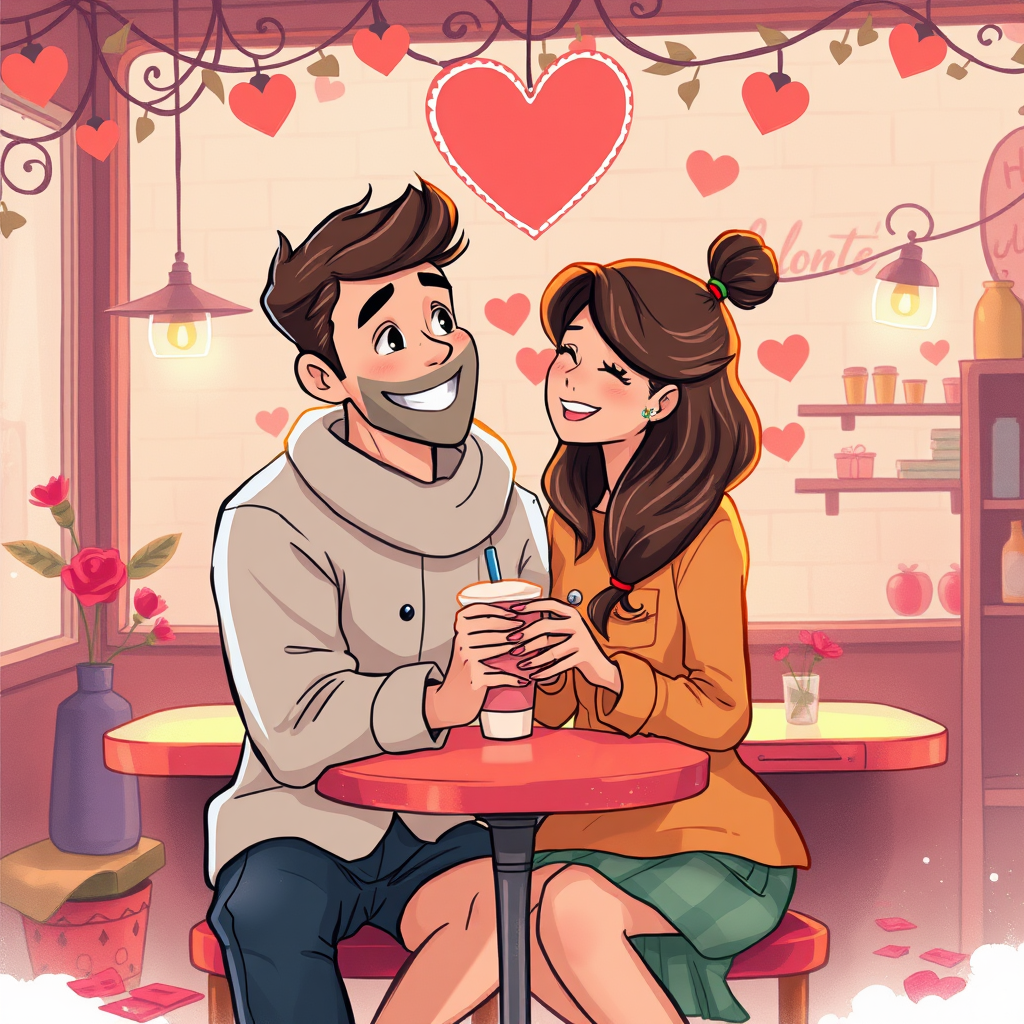 Valentine's Day scene featuring a couple in a cute, dreamy setting with elements of graphic novel-inspired illustrations. The composition blends the warm, romantic light reminiscent of Fernando Amorsolo's style with the relatable and expressive characters of Alexander Millar. Set in a whimsical, lit café environment, the characters exude a youthful, lively aura that resonates with the charm of Sketchfab designs. The scene captures a moment filled with affection and playful interactions, inviting viewers into their joyful and dreamlike world.