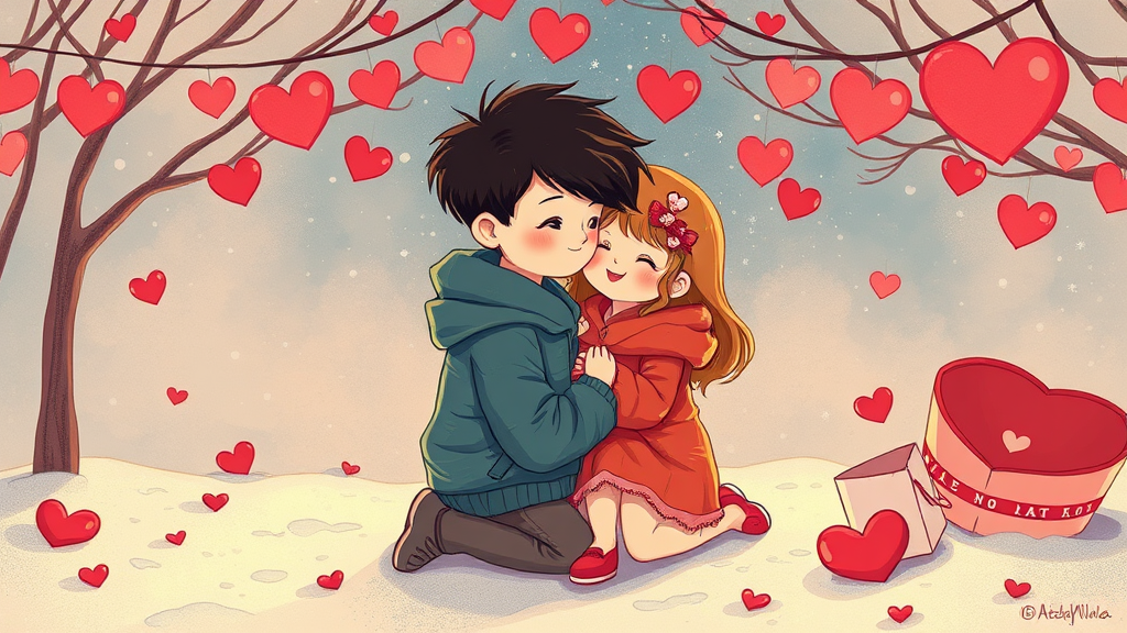 Valentine's design in the style of graphic novel-inspired illustrations, evoking the charm of Sketchfab with influences from Fernando Amorsolo's warm lighting and relatable personality. Blend this with the whimsical, heartfelt style of Alexander Millar for a cute and dreamy scene, capturing the spirit of a lit kid wrapped in a cozy, nostalgic setting. The aspect ratio is elongated, enhancing its ethereal quality, while maintaining a highly stylized approach to convey a sense of timeless romance.