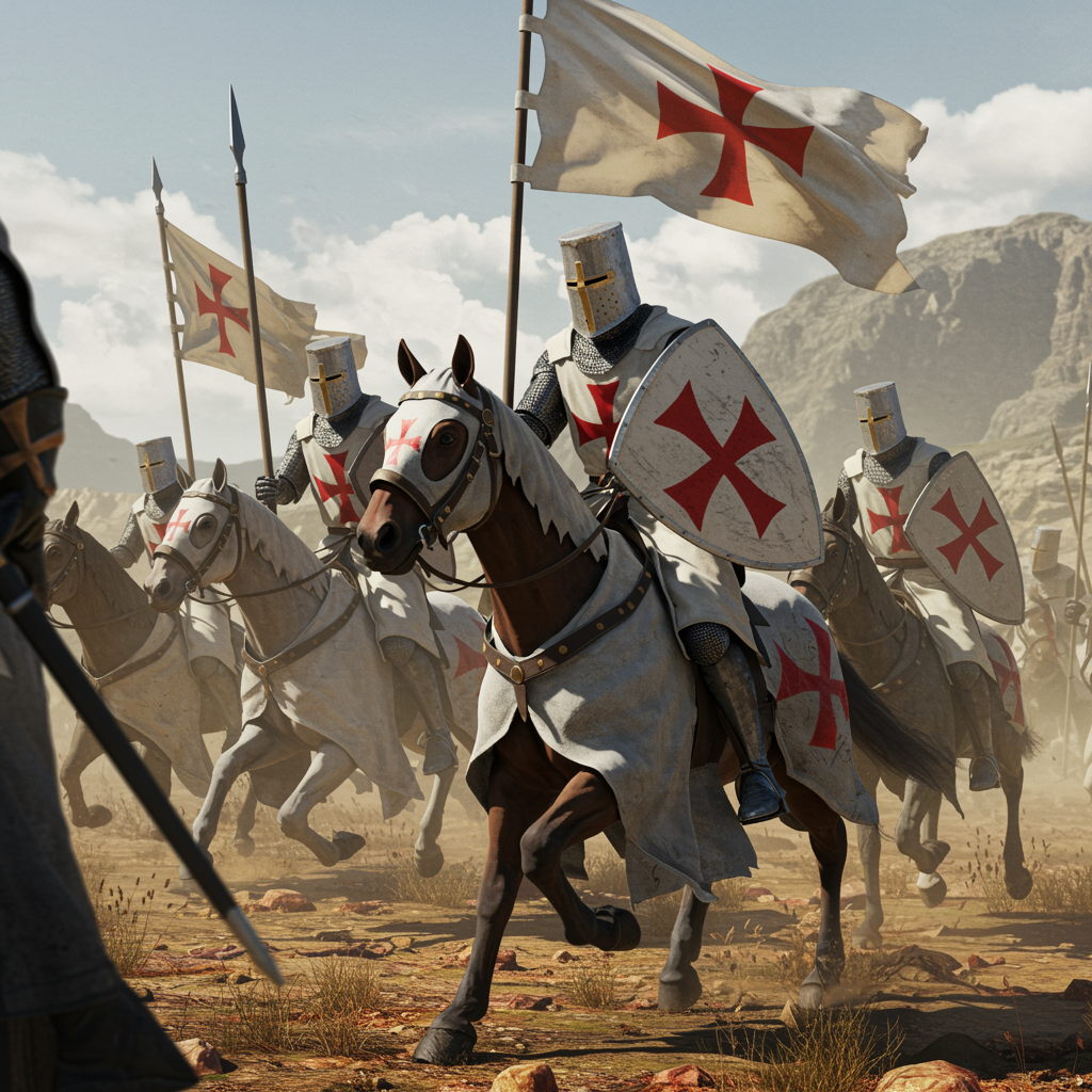 Valiant knights of the Templar order galloping fiercely into the heart of battle, their armor glinting under the harsh sunlight, a striking Templar flag billowing in the wind. Set in the 1150s, the scene captures the essence of medieval Christian valor, with subtle hints of mystery akin to the lore of the illuminati. Rendered with the precision and vivid detail reminiscent of an Unreal Engine design, the knights' meticulously crafted armor gleams with an otherworldly luster, as they charge across a rugged landscape. The atmosphere is charged with intensity, encapsulating the spirit of determined bravery and enigmatic undertones.