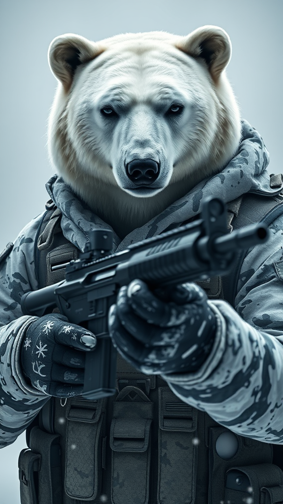 Valiant polar bear clad in a detailed arctic camouflage military uniform, gripping an advanced carbine rifle, anthropomorphic features, hyper-realistic detail, 8k resolution, lifelike representation, striking facial details, moody cinematic lighting, aspect ratio 9:16, quality emphasis on realism, intricate snowflake reflections, fierce yet noble expression, battle-ready stance.