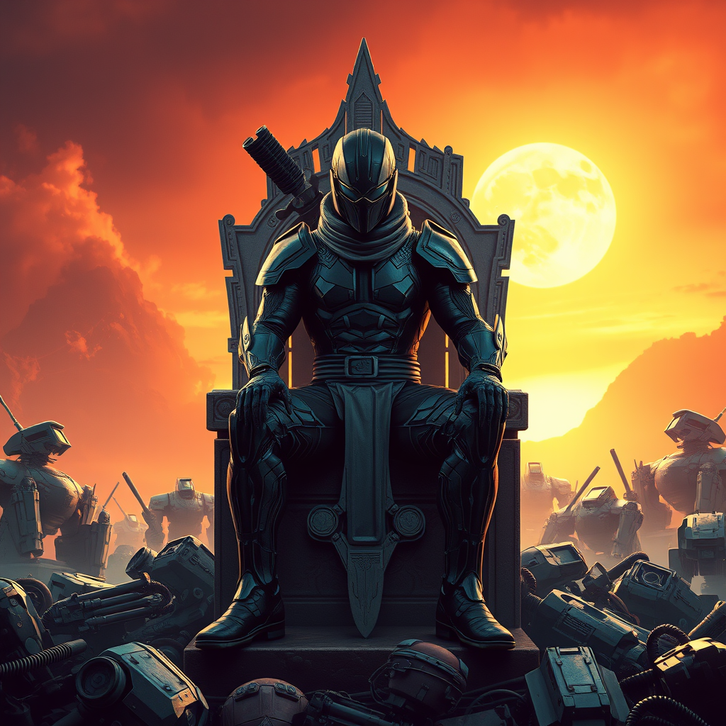 Valiant warrior clad in an intricately designed futuristic black ninja suit seated on a throne composed of dismantled robots, showcasing impeccable body proportions. This scene echoes the style of a classic Soviet poster, with a hint of USSR nostalgia, against the backdrop of defeated mechanical mechs. The dawn light casts an epic glow, with an aesthetic inspired by anime and manga graphics, featuring dark, moody tones. The entire composition is reminiscent of offset printing, boasting high detail in 8K resolution, capturing the essence of CMYK poster design with cinematic lighting, giving an epic and dramatic atmosphere.