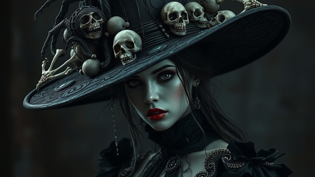 vampire witch adorned with an elaborate hat featuring skeletal motifs, capturing a haunting yet elegant presence, embodied in a style reminiscent of eve ventrue's dramatic flair, enhanced with vray tracing for photorealistic depth, and drawing inspiration from paul hedley's western-style portraits. infused with a touch of cartelcore's gritty aesthetic, the scene is rendered as a uhd image, echoing the somber yet captivating allure of death burger, embodying a striking and bold visual narrative.