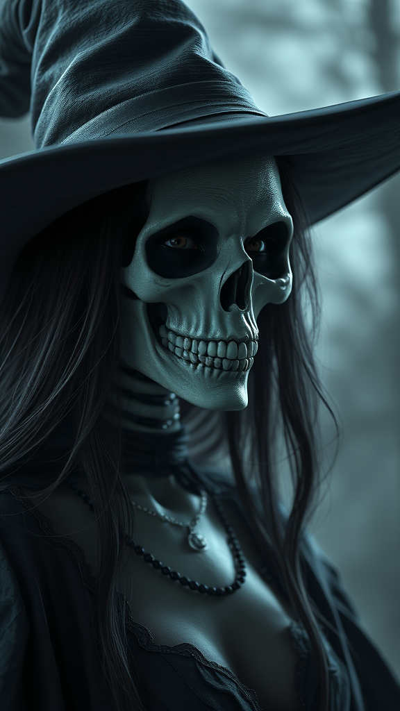 Vampire witch with a skeletal visage and a wide-brimmed hat, captured in the style of Eve Ventrue and Paul Hedley, blending the refined details of Western-style portraits with a hint of cartelcore edge. Rendered with VRay tracing for ultra-high-definition clarity, the scene exudes a dark, enigmatic allure, reminiscent of a "death burger" aesthetic, accentuating the witch's otherworldly presence against a moody backdrop.