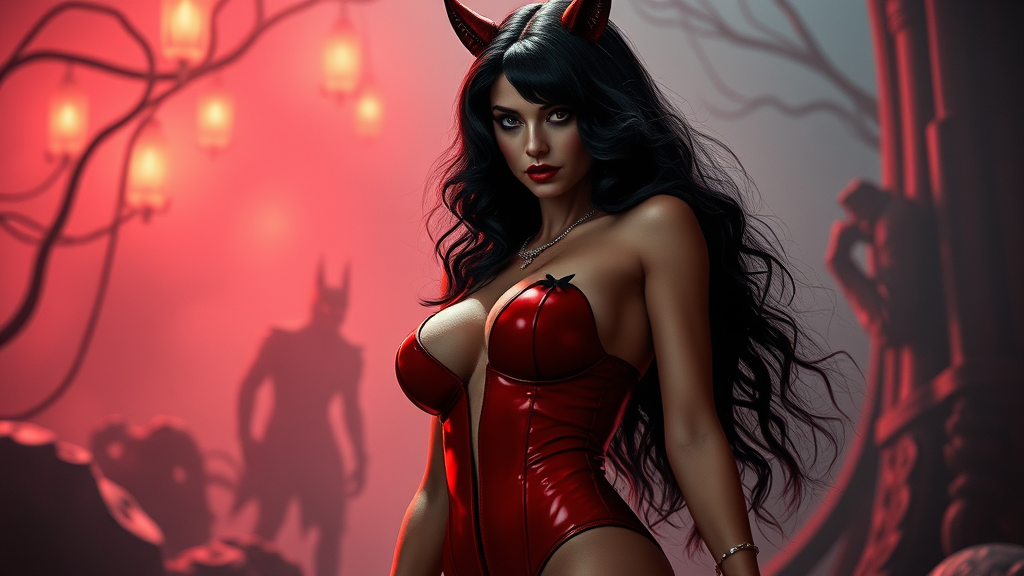 Vampirella Ella Normandy from Warren Publishing, an enchanting and charming young woman with an athletic physique and stunning curves, evoking intriguing silhouettes; a full body scene filled with an atmosphere of dread and suspense in the style of classic horror films, reminiscent of the ethereal artistry of Jessica Drossin, blended with a touch of kitschy flair and catcore aesthetics; life-size figures enhance the macabre yet captivating ambiance.