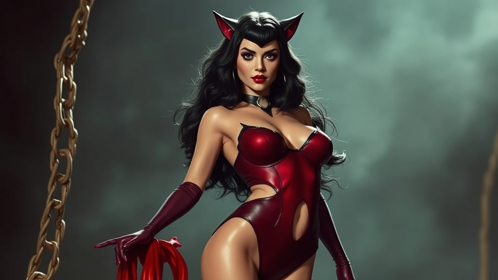 Vampirella Ella Normandy from Warren Publishing, captivating and enigmatic woman, athletic physique, stunning silhouette, intriguing contours, full body portrayal, aura of terror and dread, reminiscent of horror cinema, styled like Jessica Drossin, kitschy elements, life-sized representations, feline-inspired aesthetics.