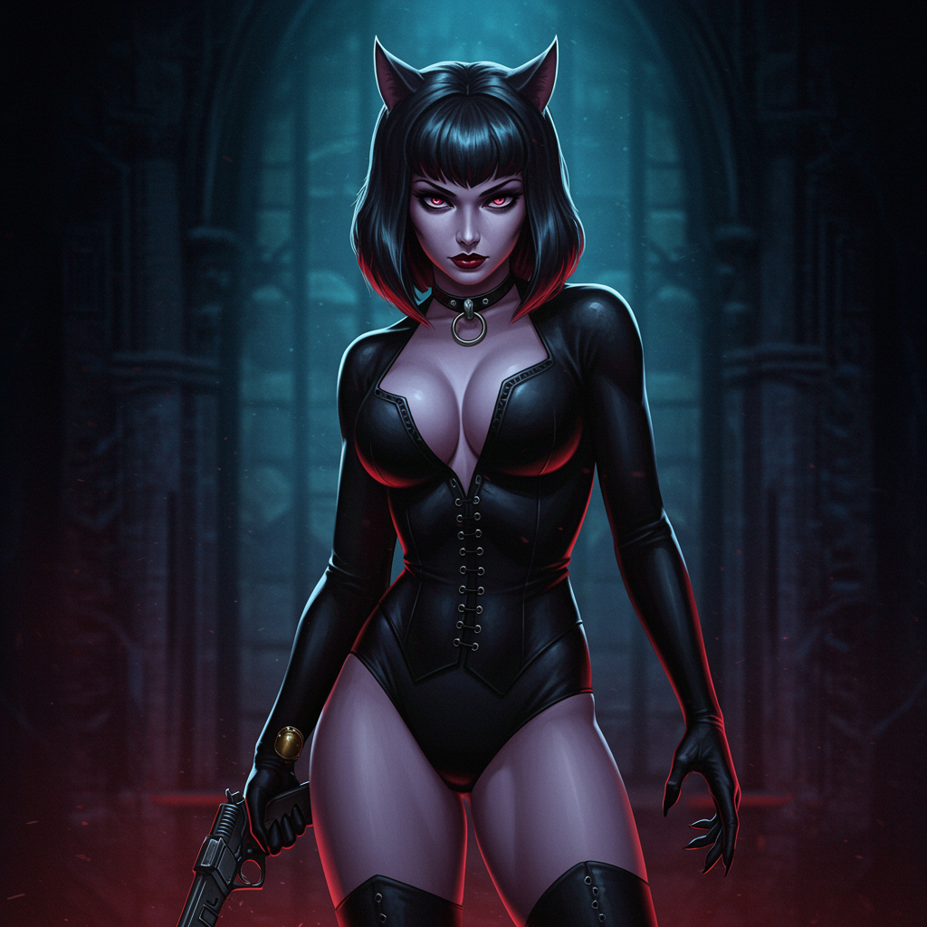 View this AI-generated image featuring vampirella inspired character strikingly beautiful and charismatic with an athletic physique and captivating figure enveloped in an aura of horror and suspense reminiscent of classic horror films styled like jessica drossin s work exhibiting kitsch elements wit