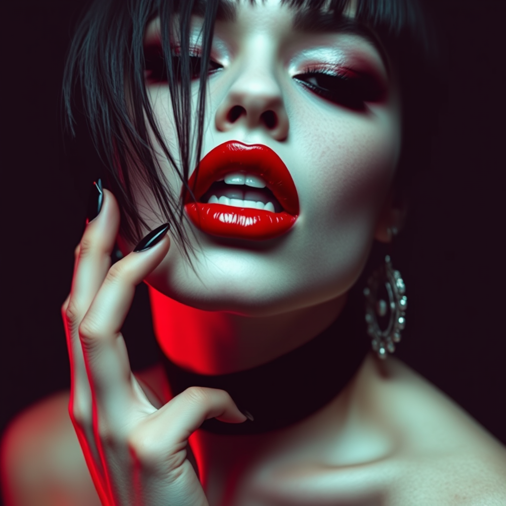 Vampiric allure with vivid lipstick, surreal and edgy tones, evoking the styles of Veronika Pinke and Ina Wong, infused with gothcore aesthetics. Echoes of Ren Hang’s provocative touch, shrouded in dark, moody colors, play with contrasting scales to create unsettling harmony. Emphasize elongated shadows and exaggerated features against stark backgrounds, blending mystique with a raw, unfiltered edge.