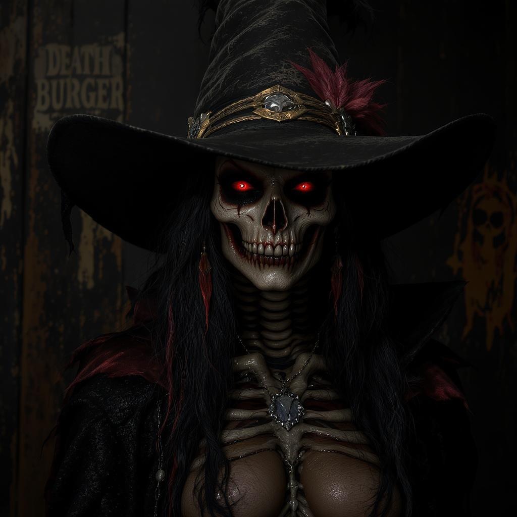 Vampiric witch in a wide-brimmed hat with skeletal features, captured in a style reminiscent of Eve Ventrue, featuring intricate VRay tracing and the refined touch of Paul Hedley. Set against a western-style portraiture, infused with cartelcore elements, this UHD image echoes the dark allure of death burger, crafting an atmospheric and enigmatic visual narrative.