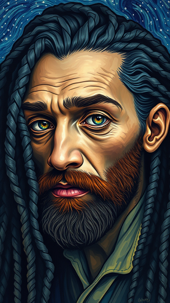 Van Gogh reimagined with ebony dreadlocks cascading over his shoulders, his piercing eyes reflecting a world of color and emotion, set against the backdrop of swirling stars.