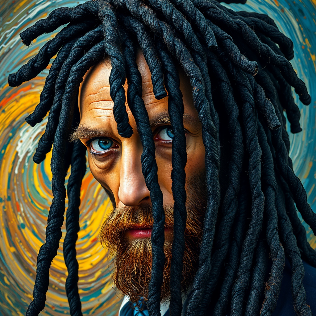 Van Gogh reimagined with ebony dreadlocks cascading down, his vibrant blue eyes peering out from beneath the intricate strands, the colors of his iconic art subtly infused into the background as if he's stepping out of one of his own masterpieces, a swirling display of vivid hues and textured brushstrokes, capturing the essence of his passionate spirit and creative genius.