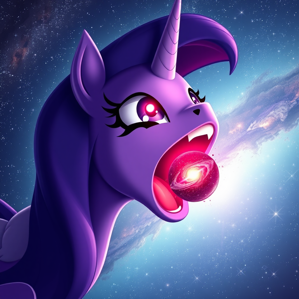 Vast and majestic Twilight Sparkle from My Little Pony, her colossal form eclipsing the stars, looms larger than a galaxy while suspended in the cosmic expanse; a tiny galaxy hovers delicately before her immense, open mouth, ready to be consumed. Her eyes, ablaze with a powerful red glow, cast an intense light across her ethereal mane. The scene captures a hyper-realistic, zoomed-in perspective that magnifies the awe-inspiring moment as she draws the galaxy into her vibrant and animated presence.