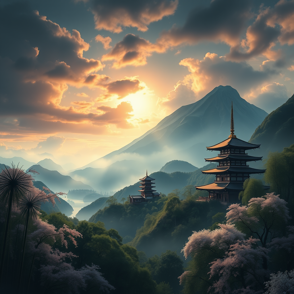 Vast panorama of a majestic Japanese landscape, infused with a Kingdom Hearts ink style, capturing the essence of dramatic light and shadow. The scene unfolds in brilliant detail, as if rendered in 8k, showcasing serene mountain ranges and ancient temples under a sky painted with luminous hues. Soft mist weaves through towering bamboo forests, while cherry blossoms dance on whispers of wind. The composition is elegant yet dynamic, maintaining the core concept with subtle creative flourishes.