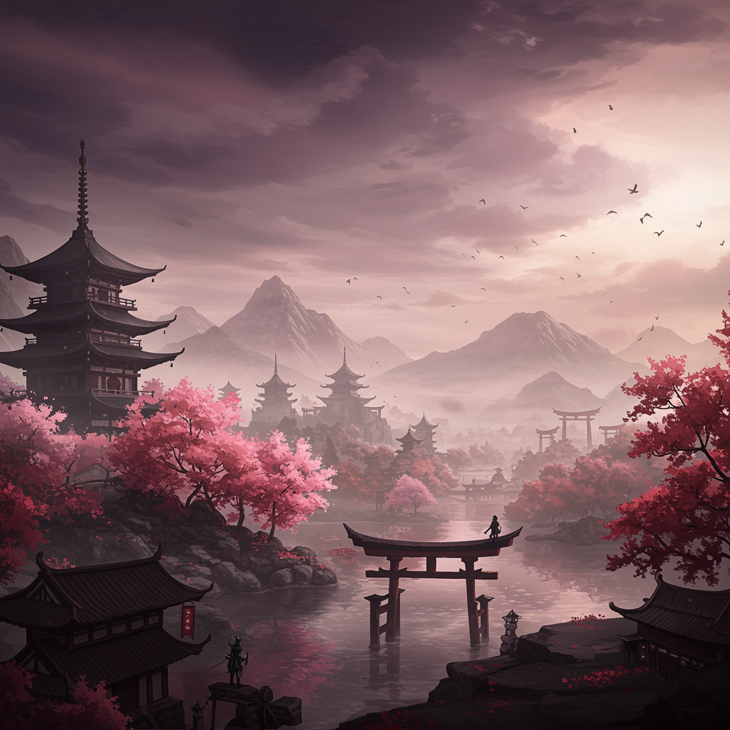 Vast panoramic vista of a majestic Japanese landscape, captured in a breathtaking tapestry reminiscent of Kingdom Hearts, rendered in delicate ink style. The scene is infused with dramatic, ethereal lighting that casts intricate shadows and highlights across ancient cherry blossoms, towering pagodas, and serene water reflections. In the distance, rugged mountains fade into the horizon, enveloped in a mystical haze that blurs the line between reality and fantasy. This 8k imagery evokes a sense of wonder and tranquility, maintaining a dreamlike fusion of tradition and imagination.