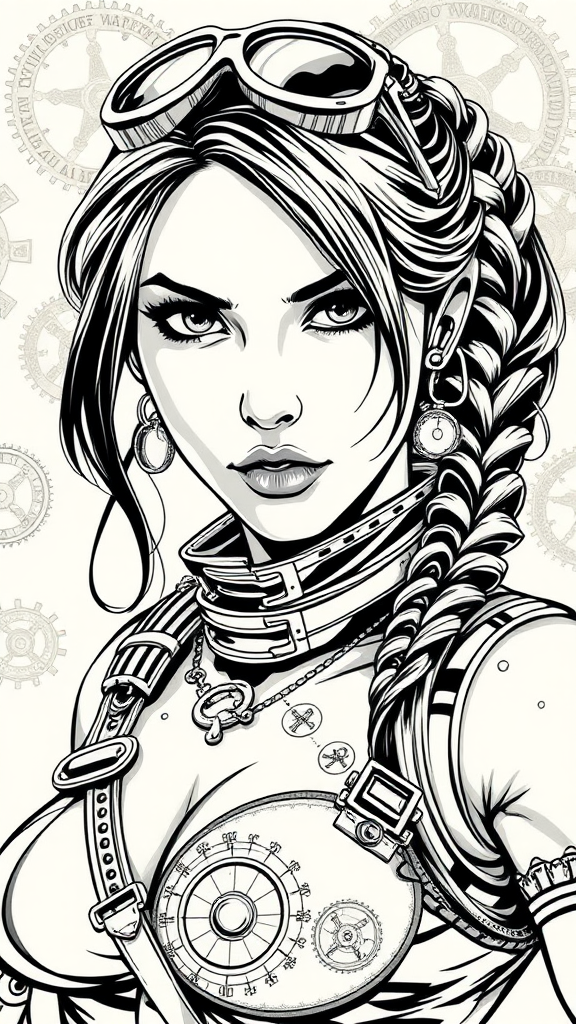 Vector art Steampunk-inspired portrait of Lara Croft, highly detailed, comic style influenced by Jim Lee, monochromatic, incorporating intricate gears and clockwork elements, dynamic pose, emphasizing a strong and adventurous expression, blend of Victorian fashion with iconic Lara Croft accessories, detailed line work and shading to create depth and texture.