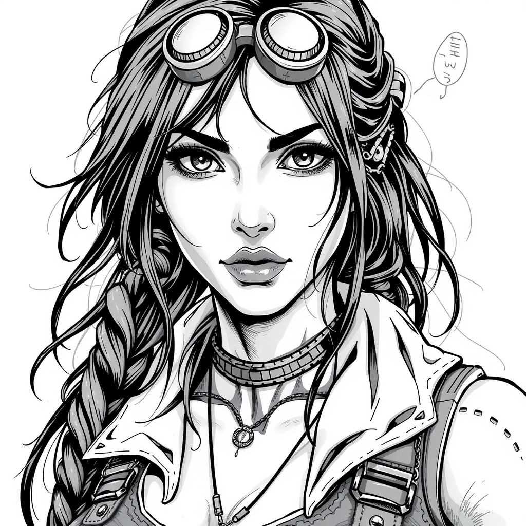 Vector art Steampunk-inspired portrait of Lara Croft with intricate details and a comic style reminiscent of Jim Lee, rendered in shades of grayscale with creative modifications incorporated throughout the design to enhance uniqueness while preserving the essence of the original concept.