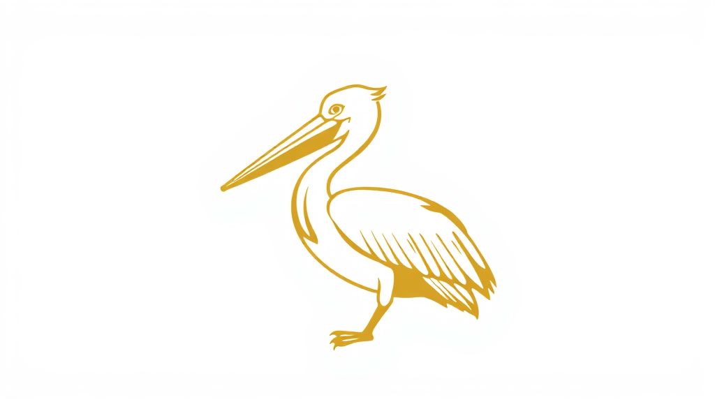 Vector drawing of a corporate logo featuring a highly stylised pelican in gold on a white background, showcasing a minimalistic and classy design. The digital vector graphic embodies a sophisticated and corporate aesthetic, crafted in the spirit of Tom Geismar's style, maintaining high-quality execution.