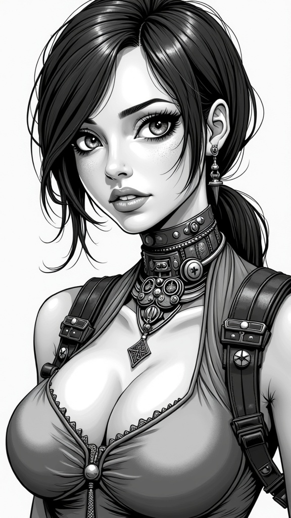 View this AI-generated image featuring vector illustration of a steampunk inspired lara croft portrait with intricate detailing and a comic book aesthetic reminiscent of jim lee s style featuring monochromatic tones with an emphasis on textures and mechanical elements integrated into her attire. Cre