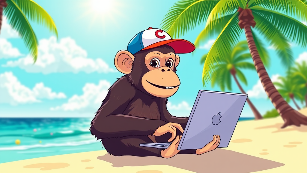 Vector illustration of a monkey wearing a baseball cap, sitting on a beach, working on a laptop. The bright and vibrant colors capture the lively atmosphere as the monkey codes artificial intelligence applications. Palm trees sway in the background, and the ocean glistens under the sun, adding to the cheerful and inventive scene.