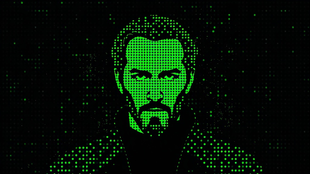 View this AI-generated image featuring a minimalistic vector illustration of keanu reeves formed by simple green dots on a splashed black matrix background using basic shapes and lines to create his likeness in a raw style with slight creative variations to the dot pattern and background texture for