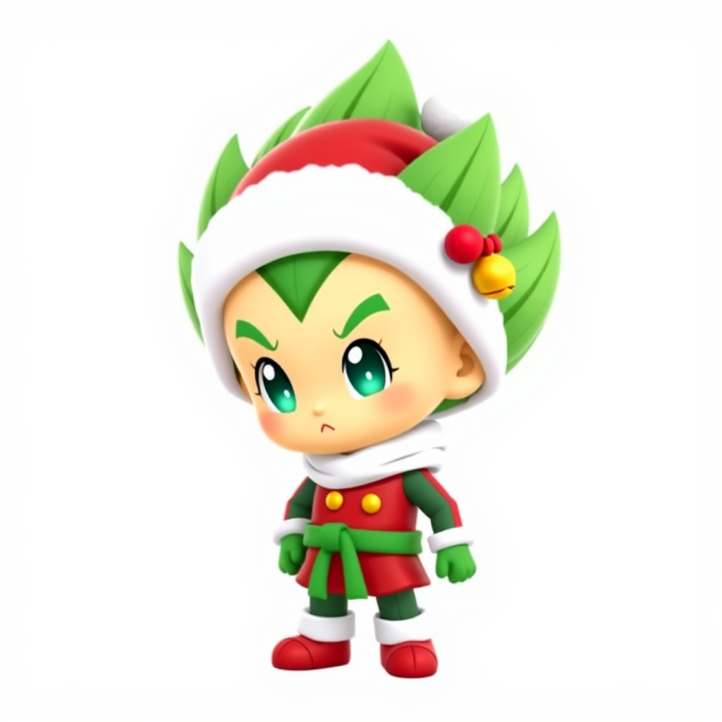 Vegeta in a festive Christmas outfit, designed in a cute, chibi 3D style, featuring a playful red and green color scheme with whimsical holiday elements like tiny bells and a fluffy Santa hat.