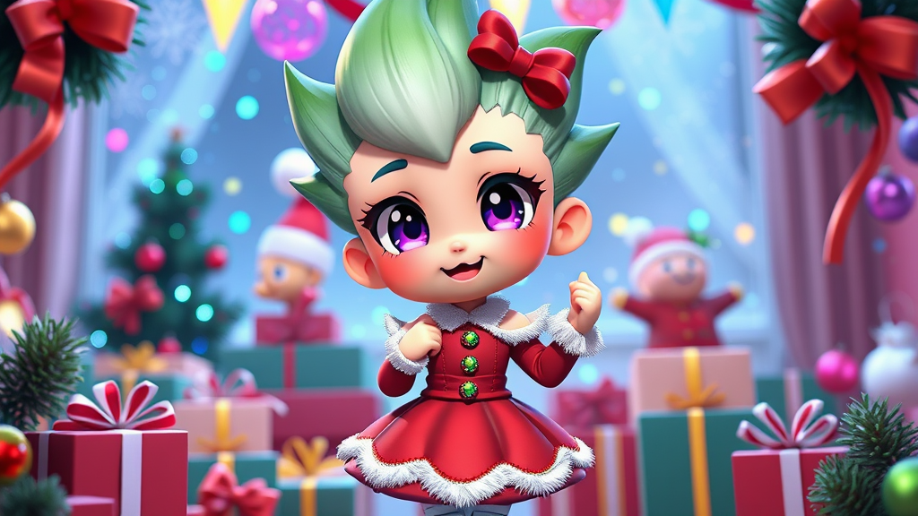 VEGETA in a festive holiday outfit with a Christmas-themed dress, styled in a cute chibi 3D design, featuring exaggerated facial expressions and playful poses, surrounded by colorful holiday decorations and sparkling lights.