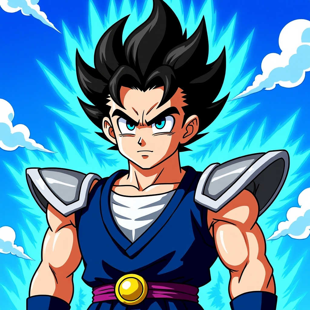 View this AI-generated image featuring vegeta the proud saiyan prince stands tall and resolute his determined gaze fixed on the horizon his iconic spiky black hair and widow s peak crown his intense expression while his muscular form radiates power and confidence clad in his traditional dark blue an