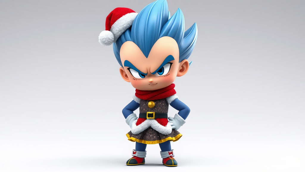 Vegeta wearing a festive Christmas dress, styled as a chibi character with exaggerated, cute proportions in a 3D rendering, featuring playful textures like sparkly fabric and a tiny Santa hat, while maintaining his iconic scowl and confident stance.