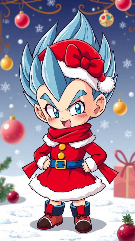 Vegeta wearing a festive Christmas dress, with a chibi 3D art style, featuring exaggerated expressions and vibrant colors, surrounded by a wintery backdrop with twinkling snowflakes and ornaments.