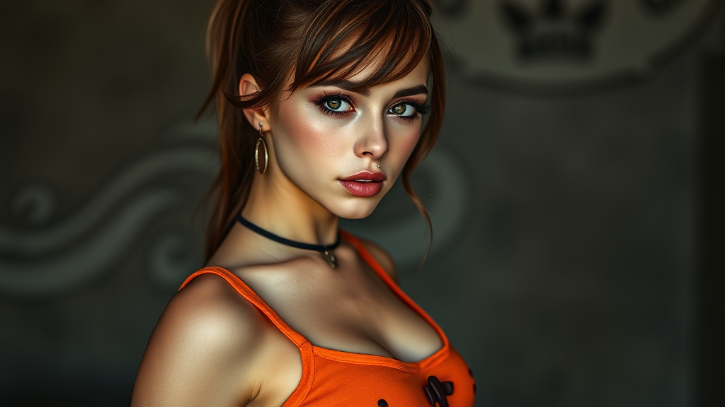 Velma from Scooby-Doo, an attractive and charming young woman with a striking piercing and an athletic physique, wearing an orange top that highlights her gorgeous figure and intriguing contours. The full-body shot captures her in a goth style with intense dark eyes, styled in the artistic approach of Jessica Drossin, represented as a life-size figure.