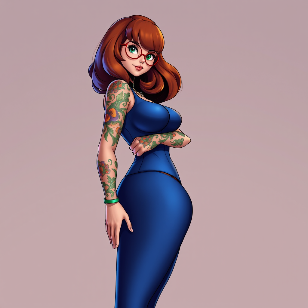 Velma from Scooby Doo in a stylish and form-fitting outfit, showcasing a curvy figure with artistic tattoos, set against a simple backdrop. The image features vibrant and realistic illustrations, drawing inspiration from niji3d style. The focus is on a high-definition, detailed depiction without any cropping, low resolution, text, signatures, watermarks, usernames, or blurring. The composition avoids multiple views, extra limbs, masks, or any form of distortion, ensuring a clean and clear presentation.