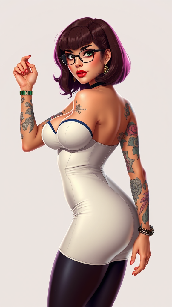 Velma from Scooby Doo in a sultry, form-fitting outfit, showcasing a curvy figure adorned with intricate tattoos, set against a minimalist backdrop. The vibrant illustration presents an ultra-realistic depiction in a style reminiscent of niji3d, capturing contrasting views without digital imperfections or overlays.