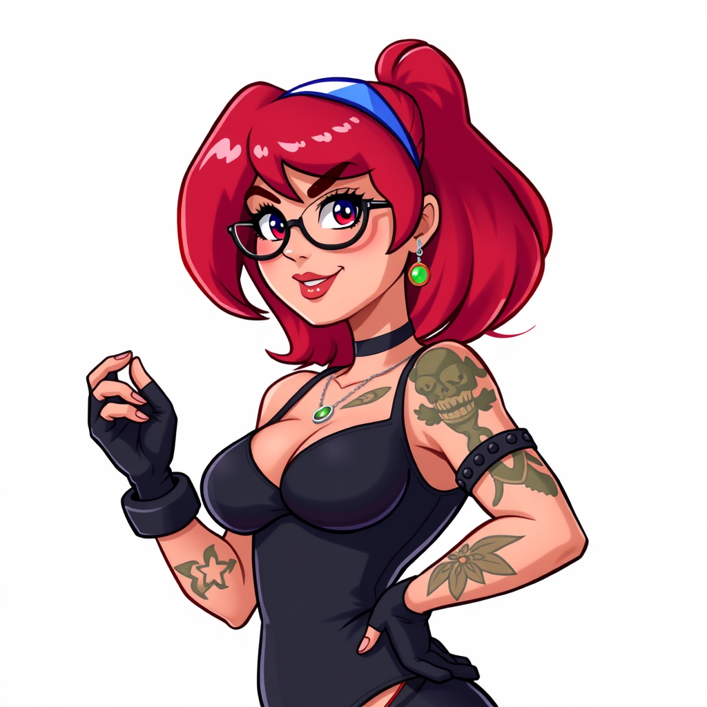Velma from Scooby Doo, solo, in a stylish and modern outfit, showcasing a curvy figure with unique tattoos, set against a simple background. The scene is ultra-realistic with vibrant colors and detailed illustrations, inspired by the niji3d style. The image is sharp and polished, focusing on high-quality details, and avoids any distractions like text, signatures, or watermarks, ensuring it is crisp and clear without blurs or artifacts.