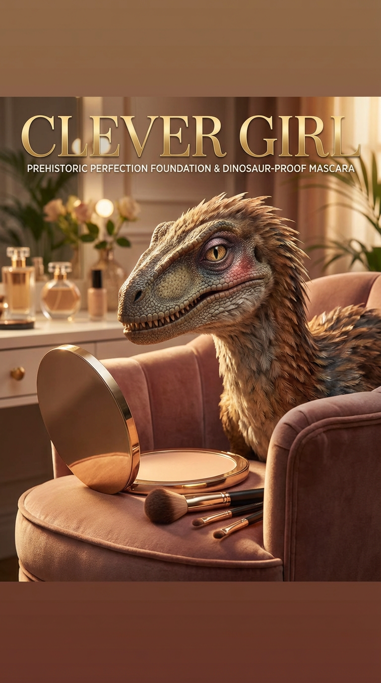 A detailed Velociraptor with blush and eyeshadow sits in a plush chair, looking at a compact mirror. The scene is set at a luxurious vanity table with various makeup products and perfumes, creating a humorous and unexpected advertisement.