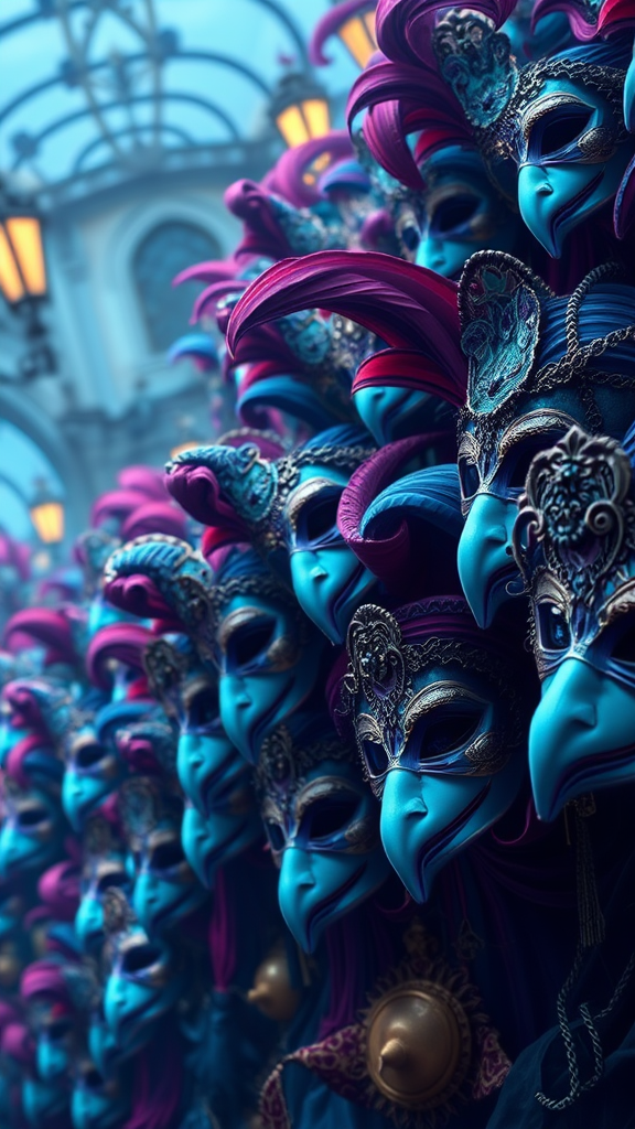 Venetian carnival scene, exuding fantastical and colorful energy, features a captivating symmetry and spiral layout. The palette is dominated by rich navy and aquamarine hues, with gothic influences subtly woven in. Unique and distinctive noses add character to each mask in the crowd. The atmosphere is vivid and expressive, drawing inspiration from anime styles while maintaining an immersive, eye-catching composition.