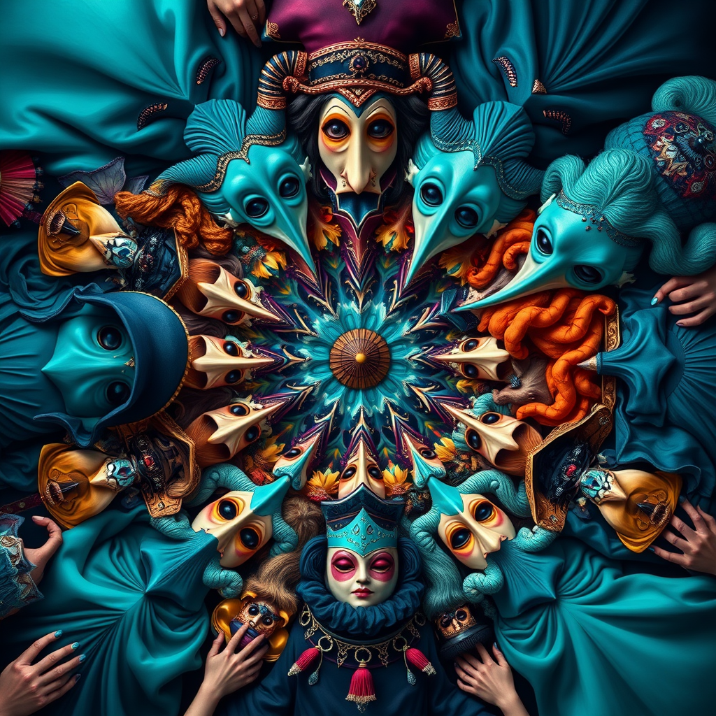 Venetian carnival scene, fantastical and colorful, featuring eye-catching, symmetrical arrangements. Incorporating deep navy and aquamarine hues, with people displaying distinctive noses and subtle gothic elements. A swirl of characters in a spiral formation, evoking a lively and vibrant atmosphere.