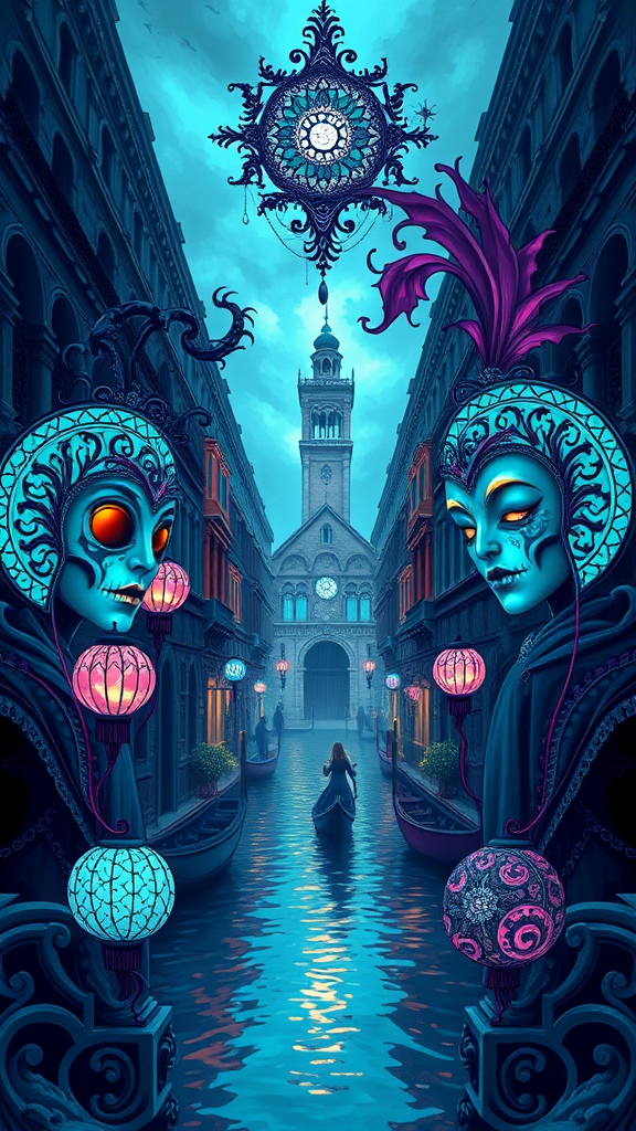 Venetian carnival scene, fantastical artistry, vibrant, captivating compositions, symmetrical design, deep navy and luminescent aquamarine hues, prominent and unique profiles, gothic influences, circular ensembles, executed in an expressive manner with an anime touch, version 5, intricate details.