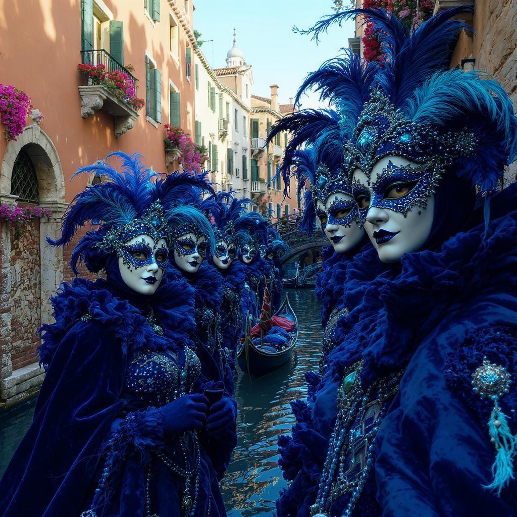 View this AI-generated image featuring venice carnival scene brimming with whimsical elements vibrant and captivating featuring harmonious symmetry predominantly navy and aquamarine hues characters with unique prominent noses and gothic touches arranged in a spiral formation the composition exudes a