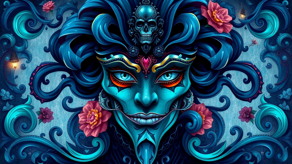 Venice carnival scene, fantastical and vibrant compositions, symmetrical layout, rich navy and aquamarine hues, striking and distinctive facial features, gothic influences, swirling arrangements, visually expressive --aspect ratio 804:1344 --anime-inspired --niji style 5 --expressive style level 250 --version 5.