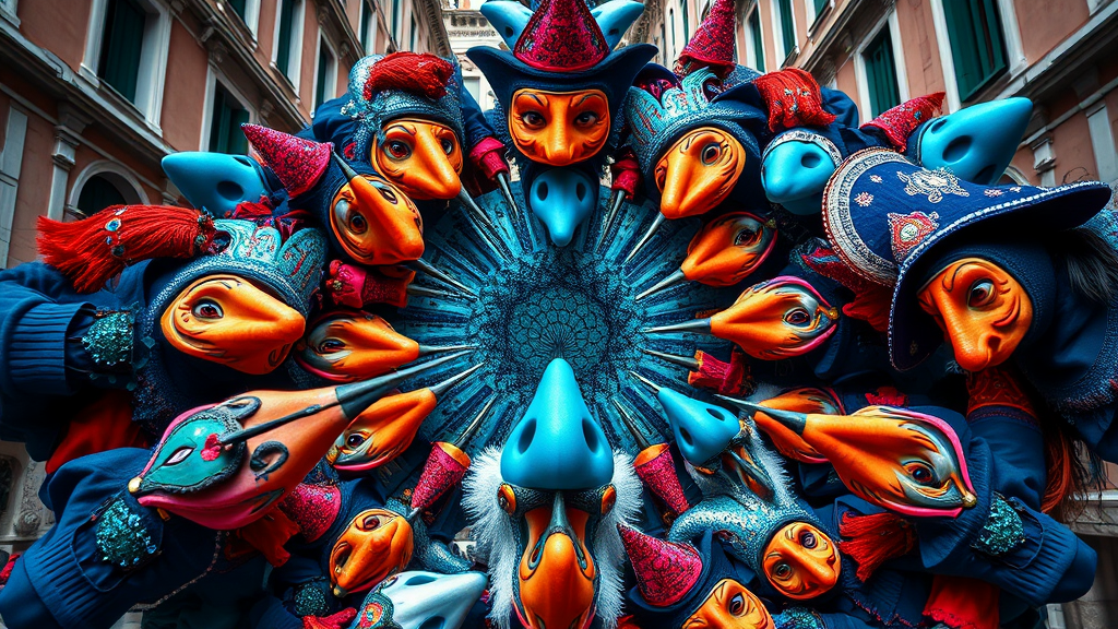 Venice during a vibrant carnival, captured in a fantastical composition, filled with colorful and eye-catching elements. The scene features symmetrical arrangements in a palette of navy and aquamarine, highlighting striking and distinctive noses. Gothic influences are woven throughout, with participants forming a dynamic spiral group. Expressive and whimsical, the composition captures the essence of celebration and mystique.