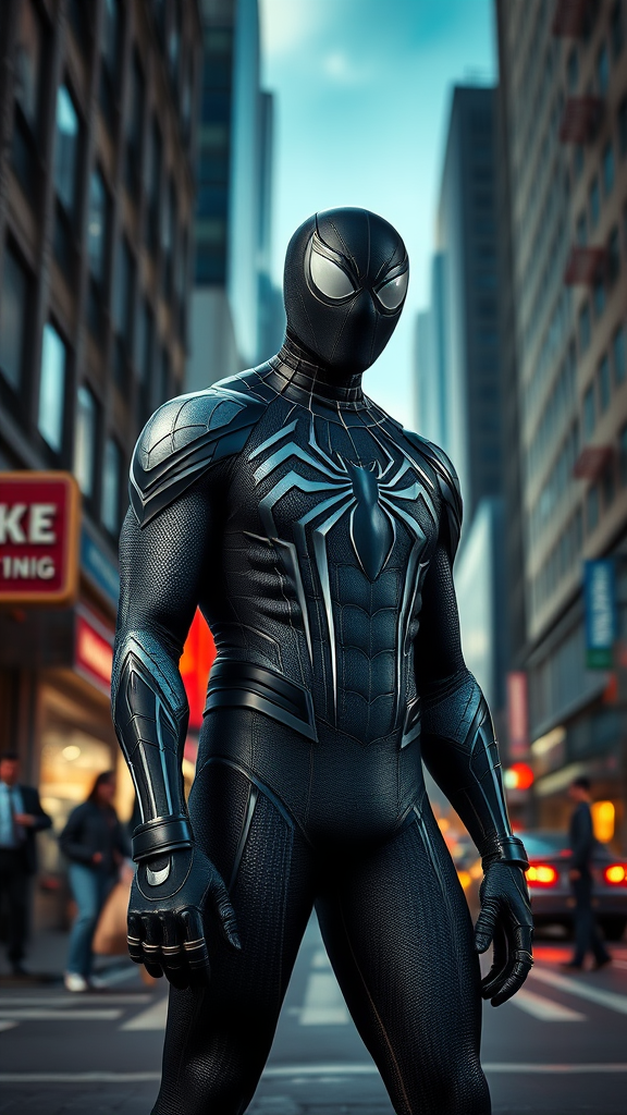 Venom-infused Spider-Man standing on a bustling New York street, captured with ultra-realistic detail using ray tracing technology. The scene is a vivid, high contrast 8k HD photograph, showcasing the intricate textures of the suit. The image is reminiscent of a professional Nikon D850 shot, utilizing Cinestill 800 film for enhanced color depth. The dramatic lighting enhances the realism, with the cityscape behind providing a dynamic backdrop. This physics-based rendering captures every nuance in stunning detail, creating an awe-inspiring visual that blends vivid color with shadowy depth.