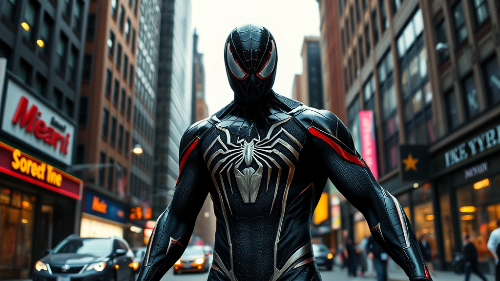 Venom-inspired Spider-Man suit amidst New York City streets backdrop, rendered with ray tracing for high detail and dynamic contrast, ultra-high resolution capturing lifelike denseness and vibrant colors, portrayed in a professional photo quality akin to Nikon D850 using Cinestill 800 film, emphasizing cinematic realism with intricate texture details and rich contrast, set in 8k HD for an immersive and vividly realistic scene.