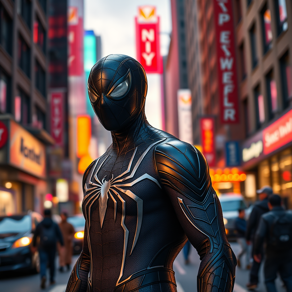 Venom suit Spider-Man standing on a bustling New York street, captured with ultra-high resolution and physics-based rendering for realistic detail. The scene bursts with high contrast and vibrant colors, reminiscent of a professional photo taken with a Nikon D850 using Cinestill 800 film. The detailed composition showcases the intricate texture of the suit against the vivid backdrop of city life, utilizing advanced ray tracing to enhance depth and realism in 8k HD quality. The image exudes a cinematic aura, infusing a dynamic yet lifelike atmosphere into the iconic superhero's presence in the urban landscape.