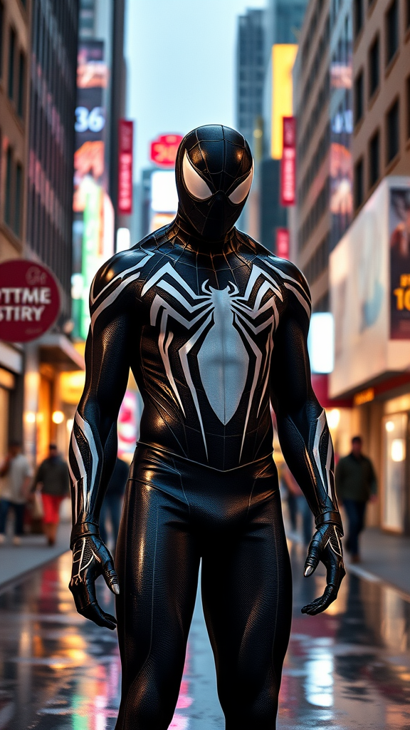 Venom suit Spider-Man stands poised on a bustling New York street, the city lights reflecting off his sleek, black suit. The background brims with the vibrant energy of Times Square, neon signs casting colorful glows on the slick pavement. Rendered with ray tracing, the high-detail color photo captures every muscle and texture with meticulous precision. This professional-grade photograph, shot with a Nikon D850 in ultra-high resolution, employs physics-based rendering to achieve stunning realism. The image is rich in high contrast, showcasing the juxtaposition of light and shadow. It emulates an 8k HD cinema-quality level of detail, reminiscent of a Cinestill 800 film, capturing the essence of dynamic movement and atmospheric depth. This interpretation adds an ethereal quality to the scene, as if the superhero could spring to action at any moment, embodying a vivid, immersive experience.