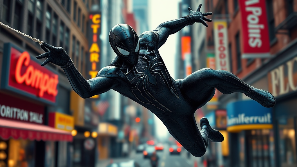 Venom suit Spider-Man swings through a vibrant New York street as the background, captured with ray tracing for enhanced realism, presenting a high-detail, ultra-high resolution color photo. Shot in a professional setting with physics-based rendering, this image boasts photo-realism with striking high contrast. Rendered in 8k HD, every detail is meticulously captured, ensuring top-notch quality. Taken with a Nikon D850 on Cinestill 800 film, the scene is imbued with cinematic depth and texture, while Spider-Man's suit glistens ominously, harmonizing with the bustling urban environment around him.