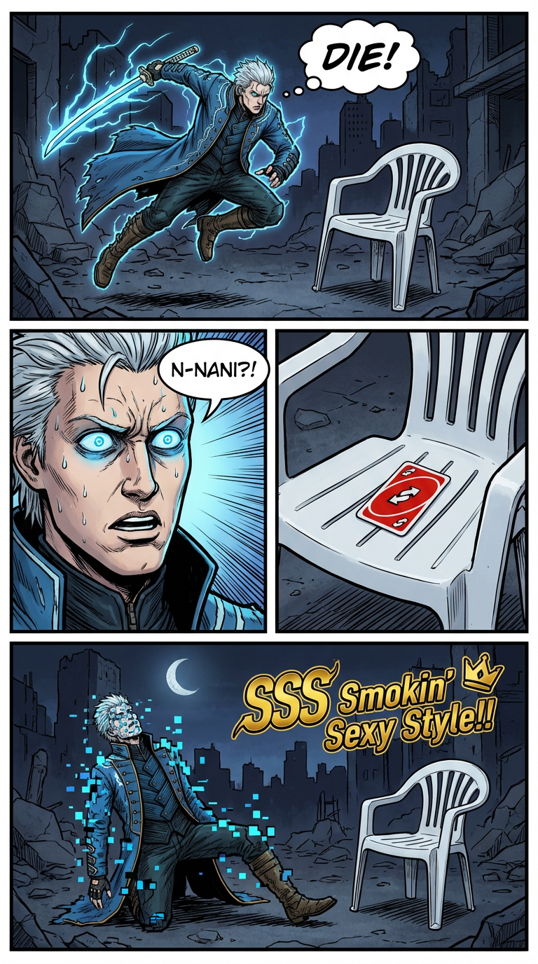 Comic book panel art style. A four-panel comic strip. **Panel 1:** Vergil from Devil May Cry, in his blue coat, mid-swing with his katana, summoning blue energy. He is attacking a simple white plastic lawn chair in a ruined urban landscape at night. Dark, moody lighting. **Panel 2:** Close-up of Vergil's face, looking shocked and slightly sweaty, with wide blue eyes. **Panel 3:** Close-up of the white plastic lawn chair, with a red UNO Reverse card placed perfectly on its seat. **Panel 4:** Vergil stands defeated, his body glitching and pixelating into cubes, with a golden "SSS Smokin' Sexy Style!!" logo floating above. The white plastic chair is intact beside him. Dark, ruined city background.