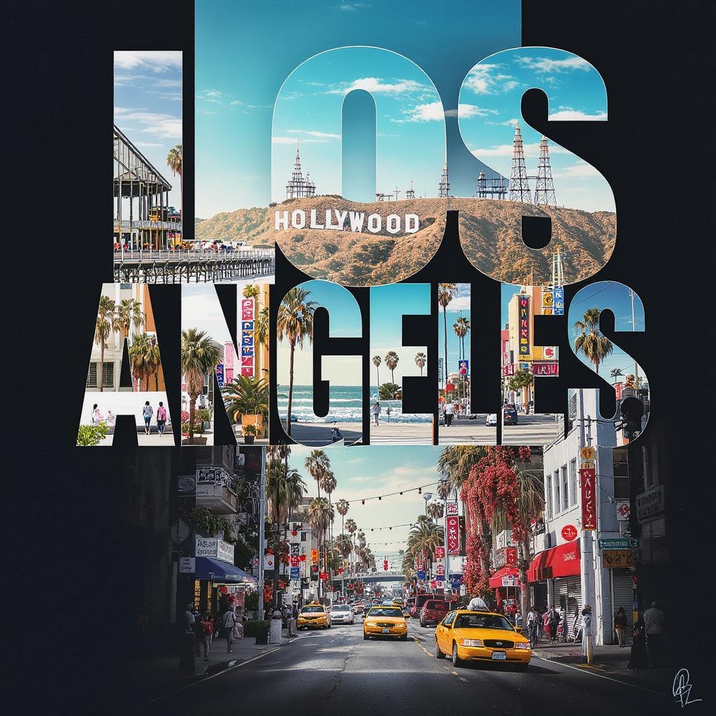 A vibrant vertical collage captures the essence of Los Angeles in a striking, high-contrast cinematic style. The letters of 'Los Angeles' are each represented by dynamic scenes featuring iconic landmarks and moments in time. The Santa Monica Pier and Hollywood Sign form the stunning backdrop, while the foreground is filled with bustling street life, vintage yellow cabs, and people engaged in various activities. The atmosphere is lively and energetic, showcasing the city's vibrant spirit. Bold, eye-catching typography enhances the collage, creating a stunning visual representation of Los Angeles. Vibrant, photo-realistic, conceptual art offers a cinematic and illustrative feel without any imperfections or unrealistic features.