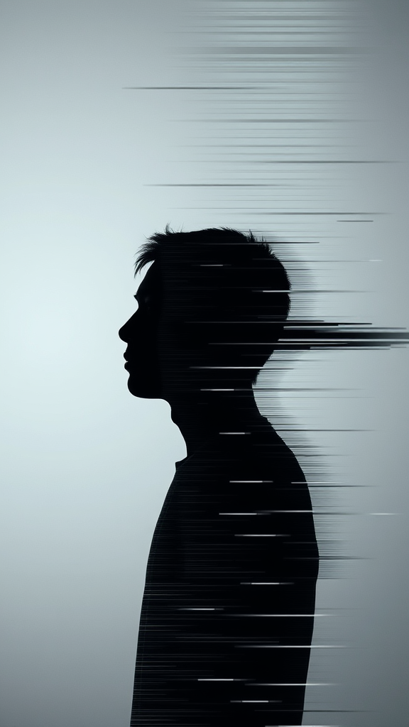 Vertical portrait of a lone human silhouette, infused with glitch art featuring linear distortion, horizontal scan lines, and digital interference. The figure is horizontally distorted with scan line interference patterns against a subtle grey backdrop. The aesthetic carries a corrupted data vibe, showcasing noise textures and horizontal artifacts. The scene is enveloped in soft, diffused lighting, maintaining a raw, digital essence with a touch of stylization.