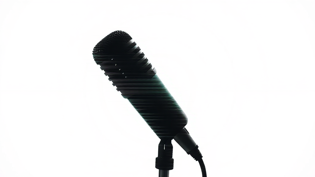 Vertical portrait of a single microphone silhouette on a minimal white background, infused with glitch art elements like linear distortion and digital interference. The figure is horizontally distorted, accompanied by a scan line interference pattern, and set against soft, diffused lighting. The artwork embraces a corrupted data aesthetic, featuring a noise texture and horizontal artifacts, maintaining a raw style and high stylization.