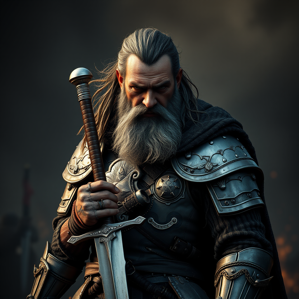 Veteran warrior with a rugged beard, clad in ornate plate armor, gripping a gleaming sword, standing resolute on a smoke-laden battlefield, detailed features and textures, intense chiaroscuro lighting, hyperrealistic and photorealistic quality, cinematic feel, ultra-high definition 8k resolution, capturing a moment of fierce determination, aspect ratio 9:16.