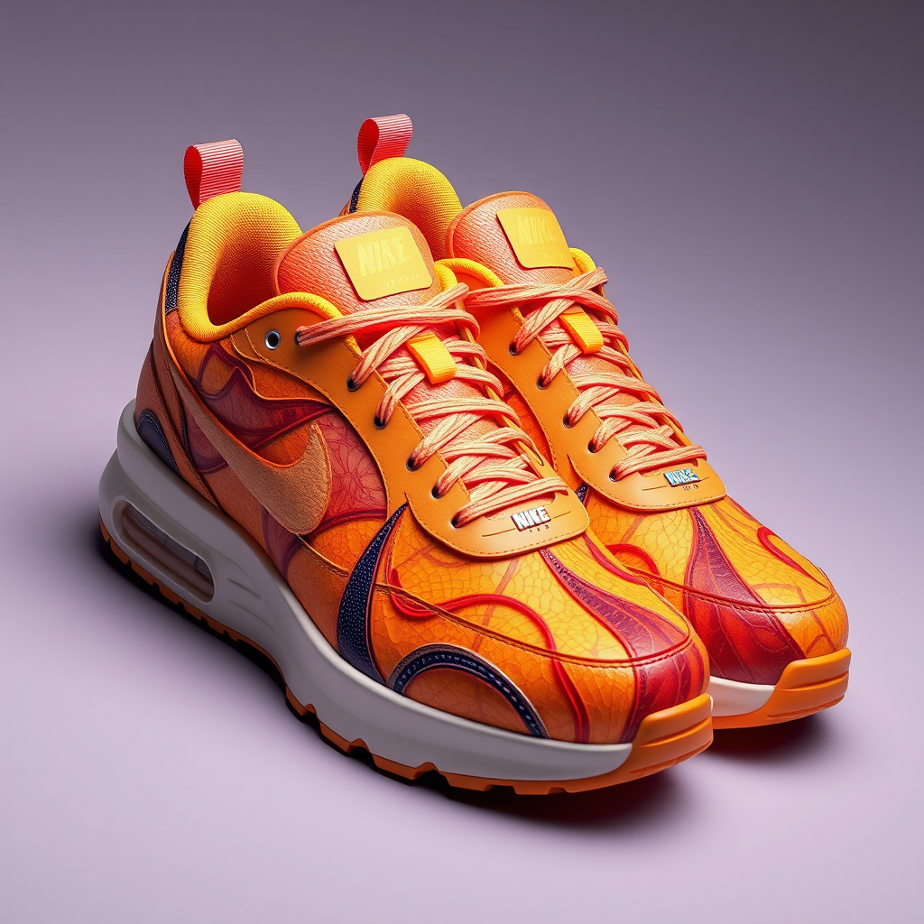 Vibrant 3D render of a pair of shoes crafted from sun-dried fruit peels, featuring a colorful palette and sleek design, showcasing the iconic Nike logo, with an emphasis on elegant composition and visually stunning artwork.